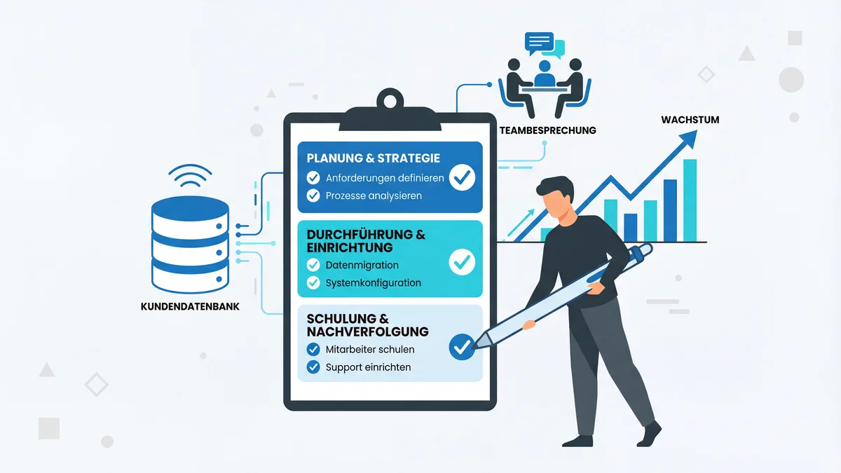 Eine CRM-Einführung Checkliste umfasst drei Phasen: Vorbereitung (Ziele, Anforderungen, Systemwahl, Stakeholder), Umsetzung (Datenmigration, Konfiguration, Schulung, Go-Live) und Nachbereitung (Optimierung, KPI-Messung, laufende Verbesserung). Jede Phase enthält konkrete Prüfpunkte, die vor dem nächsten Schritt abgehakt werden müssen.