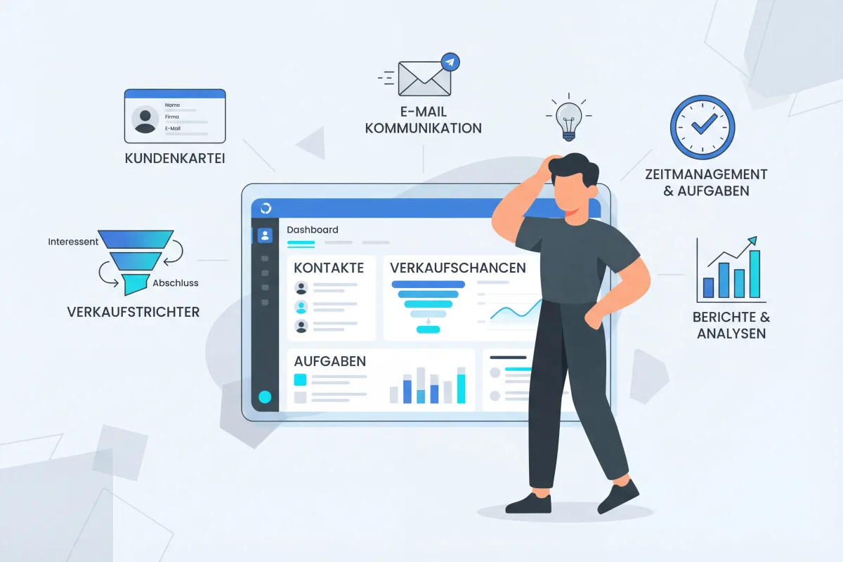 Dieser Artikel erklärt ohne Fachbegriffe, was ein CRM-System ist, welche fünf Kernfunktionen es bietet und warum sich die Investition auch für kleine Unternehmen rechnet. Für den konkreten Einführungsprozess empfehlen wir unseren Leitfaden zur CRM-Einführung.