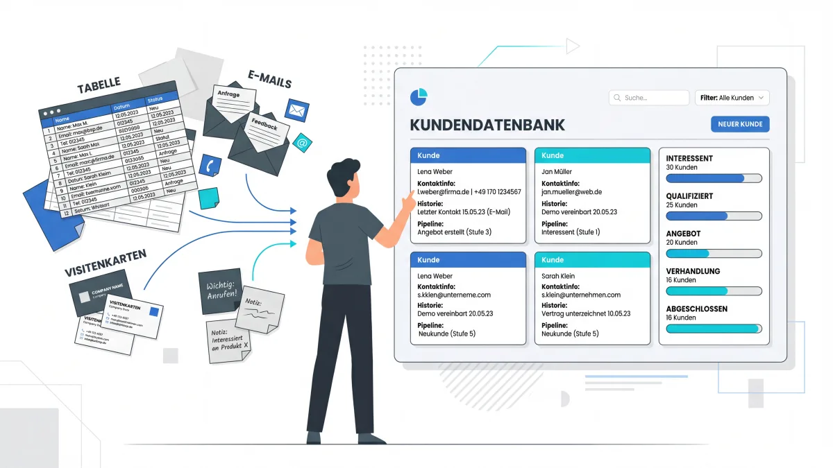 Dieser Artikel zeigt, welche Felder in eine professionelle Kundendatenbank gehören, vergleicht Excel, Access und Cloud-CRM als Plattformen und führt Sie in fünf konkreten Schritten zum Aufbau. Für den vollständigen Prozess der CRM-Einführung empfehlen wir unseren Leitfaden zur CRM-Einführung.