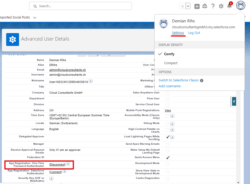 Konfigurieren Sie Authy für Salesforce: Gehen Sie auf Ihr User-Profil und klicken sie auf “App Registration: One-Time Password Authenticator